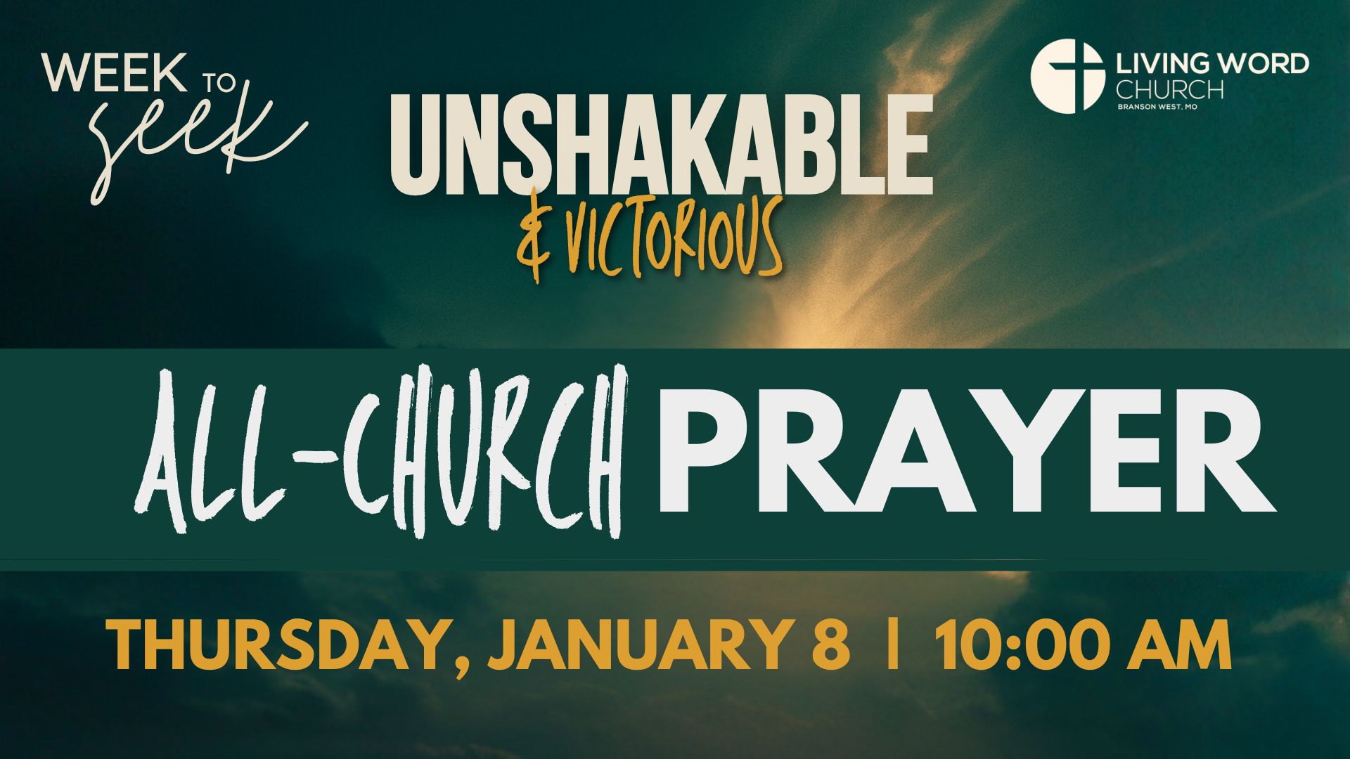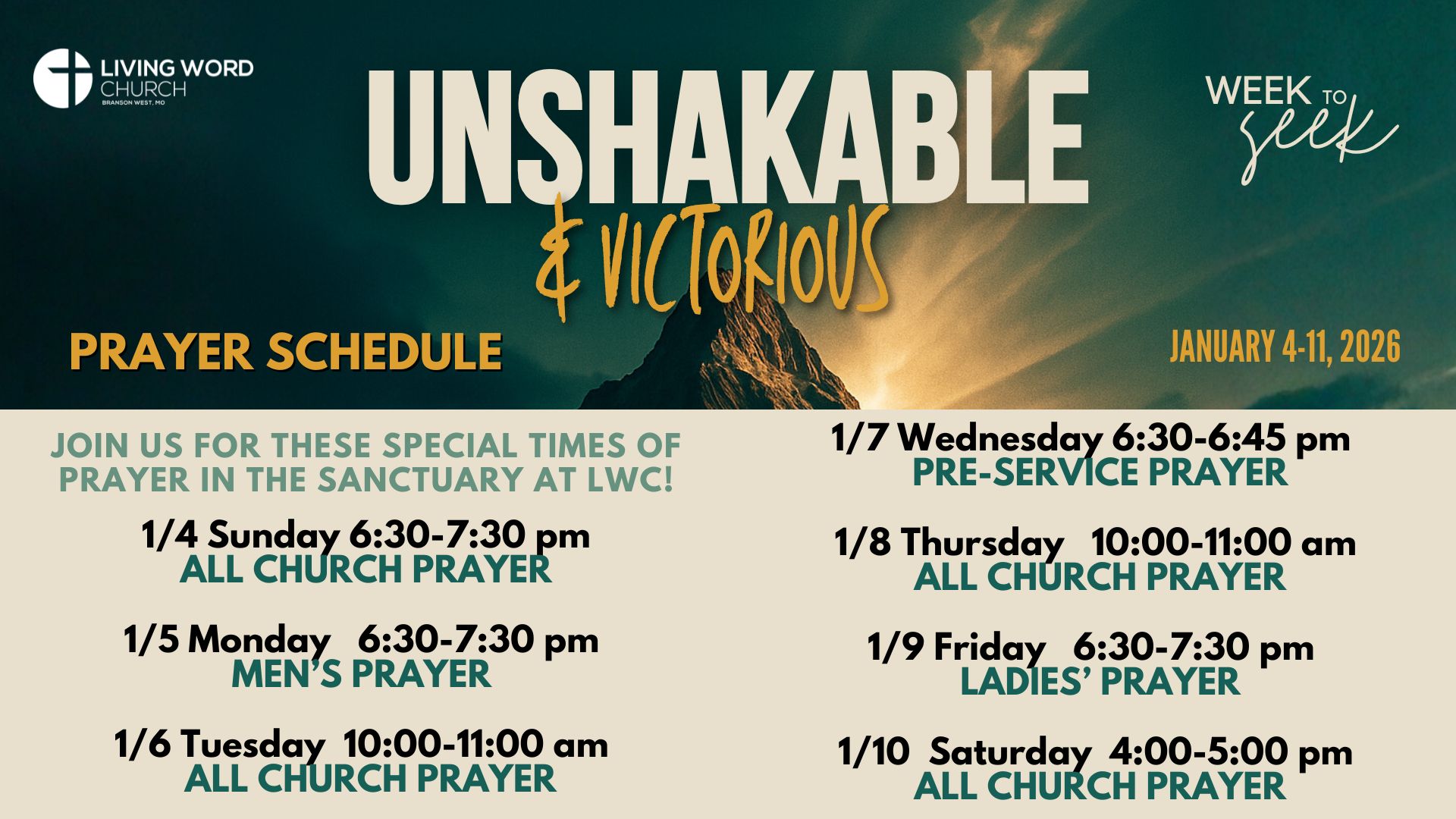 We invite the entire church family to join us at we start Week to Seek with a powerful hour of prayer. This session is open to the entire family; men, women, and kids!